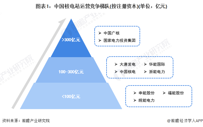 核電是我國能源供應體系的重要分支,也是新能源的重要組成部分。核電行業依據企業的註冊資本劃分,可分為3個競爭梯隊。其中,註冊資本大於300億元的企業有中國廣核、國家電力投資集團;註冊資本在100-300億元之間的企業有:中國核電、大唐發電、華能國際、浙能電力;其余企業的註冊資本在100億元以下。