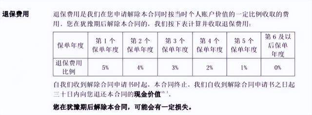 在一款名為「信泰如意鑫年金保險(萬能型)」條款中這樣介紹,投資人在猶豫期后退保,將按照不同投保年限收取一定的退保費用。投保第1個年度-第5個年度,退保費用則按個人賬户價值的5%、4%、3%、2%、1%收取。當投保第6個年度退保,退保時則不會有退保費用。