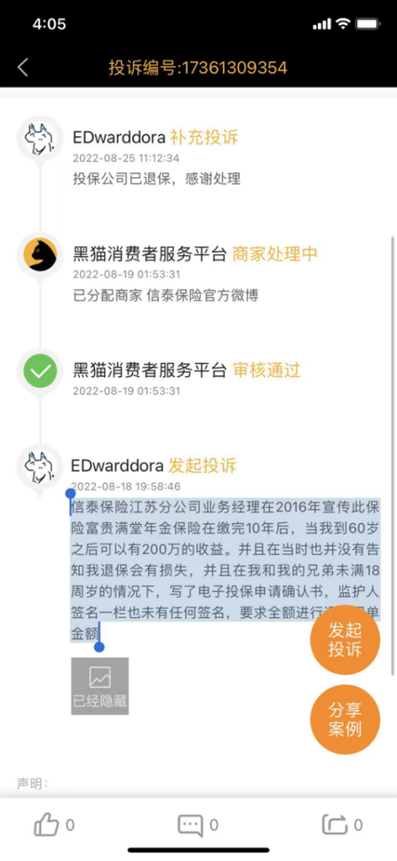 例如,2022年8月18日,一位名為「EDwarddora」的用户在黑貓APP投訴稱,「2016年,信泰保險江蘇分公司業務經理宣傳保險產品富貴滿堂年金保險繳完10年后,當我到60歲之后可以有200萬的收益。並且在當時也並沒有告知我退保會有損失,並且在我和我的兄弟未滿18周歲的情況下,寫了電子投保申請確認書,監護人簽名一欄也未有任何簽名,要求全額進行退款保單金額」。