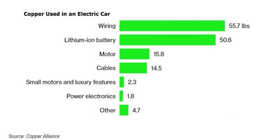 一輛電動汽車的銅含量是普通汽車的近4倍,可再生能源系統中的銅含量是傳統能源系統的12倍。風電場的用銅量為400-1500萬鎊,太陽能光伏發電場則需要9000磅/兆瓦。
