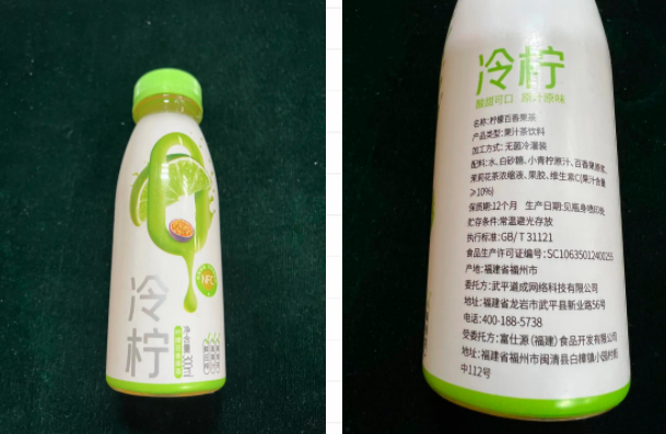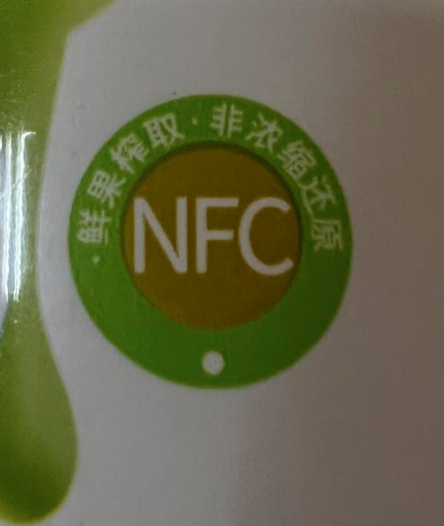 除了風味飲料,採購的樣品中還有一瓶引起了我們的注意,該飲料為檸檬百香果茶,瓶身上明確標註該飲料為「NFC」(英文「Not From Concentrate」的簡稱,中文含義為「非濃縮還原汁」,即非濃縮還原100%果汁。)