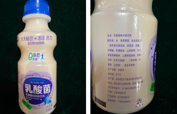 還有乳酸菌味風味飲料,大大的「乳酸菌」三個字一目瞭然,配料里卻沒有「菌」,風味飲料則以小字體寫在了下面。