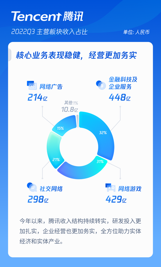 社交網絡收入下降2%至298億元,網絡廣告業務收入同比下降5%至214億元,金融科技及企業服務業務收入同比增長4%至448億元。