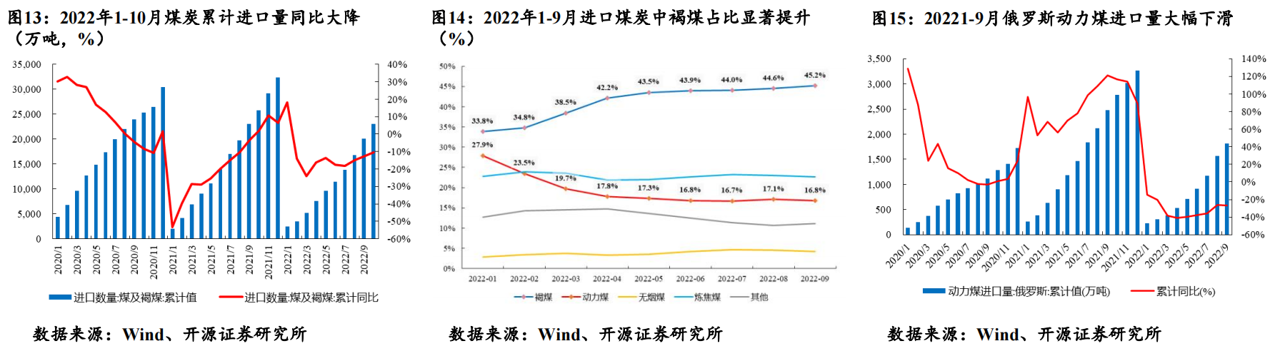 而且,進口煤炭中褐煤的比重大幅提高。到2022年9月,褐煤的進口比例從去年同期的38.3%下降到45.2%。考慮到進口煤熱值下降,且數量逐年下降,沿海電廠進口煤的實際影響較大。俄煤受限於運力增量。