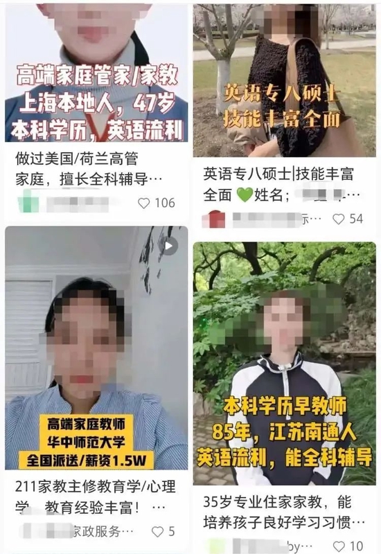 有媒體記者與社交平臺上提供家政服務的一些賬號進行溝通,對方表示,可以按照要求提供年輕、高學歷的人來進行「家政服務」。這些保姆的簡歷雖然沒有網上宣傳的那麼「厲害」,但輔導孩子功課還是綽綽有余的。對方還表示,爲了避免被封禁查處,他們都以「家政」「成長陪伴師」等對外宣傳,但主要任務還是輔導孩子功課,為他們營造良好的學習氛圍。