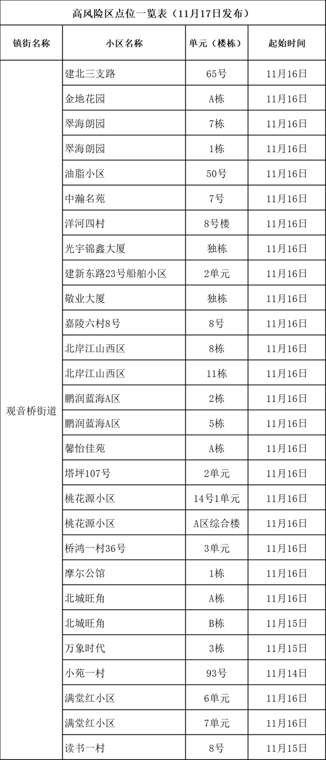 觀音橋街道:建北三支路65號、金地花園A棟、翠海朗園(1棟、7棟)、油脂小區50號、中瀚名苑7號、洋河四村8號樓、光宇錦鑫大廈、船舶小區2單元、敬業大廈、嘉陵六村8號、北岸江山西區(8棟、11棟)、鵬潤藍海A區(2棟、5棟)、馨怡佳苑A棟、塔坪107號2單元、桃花源(14棟1單元、A區綜合樓)、橋鴻一村36號3單元、摩爾公館1棟、北城旺角(A棟、B棟)、萬象時代3棟、小苑一村93號、滿堂紅小區(6單元、7單元)、讀書一村8號。