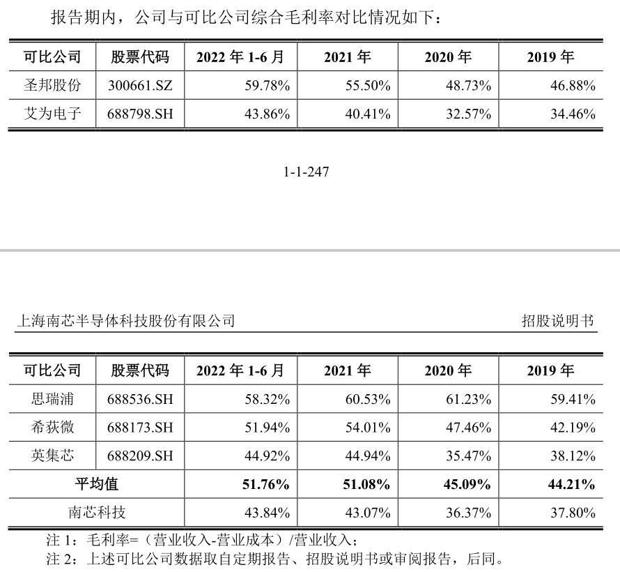 2019年至2022年上半年,南芯科技綜合毛利率分別為37.80%、36.37%、43.07%和43.84%,同期可比公司綜合毛利率平均值分別為44.21%、45.09%、51.08%以及51.76%。也就是説,在此期間南芯科技的毛利率比同行業可比公司低七到八個百分點。