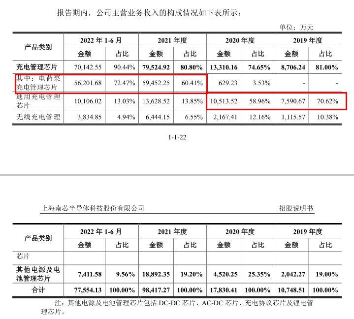 財務數據顯示,2021年和2022年上半年,南芯科技分別實現營收9.84億元和7.76億元,實現淨利潤2.44億元和2.02億元,主要得益於電荷泵充電管理芯片帶來的收入。招股書顯示,2022年上半年,電荷泵充電管理芯片營收同比增長金額對於當期營業收入增長總金額的貢獻達到85.27%,成為公司營業收入快速增長的主要驅動因素。