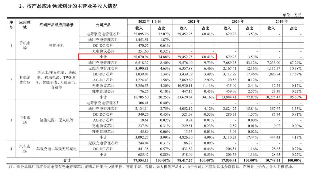 2022年手機市場收入貢獻進一步增大,2022年上半年,南芯科技在手機市場的收入達5.81億元,佔總收入比為74.88%。