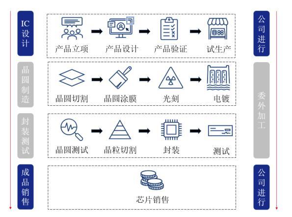 南芯科技的主營業務為模擬與嵌入式芯片的研發、設計和銷售。南芯科技採用Fabless模式,僅負責產業鏈中的集成電路研發、設計和銷售環節,將晶圓製造、封裝、測試等環節分別交由產業鏈對應的專業晶圓代工廠商和封裝測試廠商完成。南芯科技在招股書中表示,公司專注於集成電路設計,不直接參與芯片生產環節。