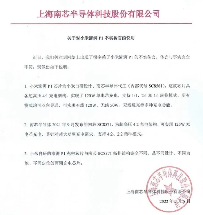 小米澎湃P1充電芯片發佈引起了市場關注,同時也引發了關於自研問題的質疑,2022年2月8日,南芯科技發文闢謠,表示小米澎湃P1芯片為小米自研設計,南芯科技代工(內部代號SC8561)。