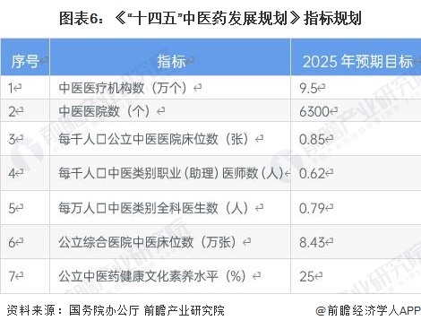 2022年3月3日,國務院辦公廳發佈《「十四五」中醫藥發展規劃》,提出到2025年,中醫藥健康服務能力明顯增強,中醫藥高質量發展政策和體系進一步完善,中醫藥振興發展取得積極成效,在健康中國建設中的獨特優勢得到充分發揮。中醫藥產業和健康服務業高質量發展取得積極成效。中藥材質量水平持續提升,供應保障能力逐步提高,中藥註冊管理不斷優化,中藥新葯創制活力增強。中醫藥養生保健服務有序發展,中醫藥與相關業態持續融合發展。部分規劃指標如下: