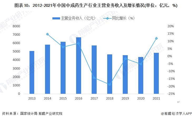 整體來看,2013-2021年我國中藥行業主營業務收入規模呈波動態勢,2020年雖有小幅下降,但在2021年我國中藥行業穩步增長,全年營業收入達到6919億元人民幣,同比增長12.4%。