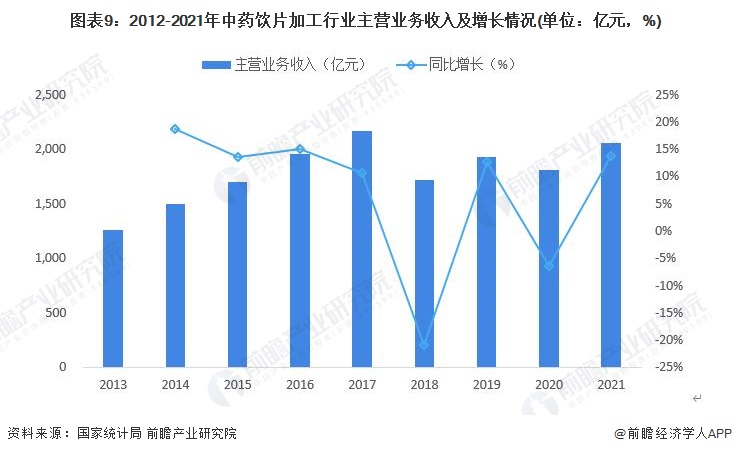 我國中藥種植面積的擴大以及售價的提升,意味着我國中藥行業的行情較為樂觀。從中藥飲片加工領域來看,2013-2017年,我國中藥飲片銷售情況持續走高,但增長幅度整體呈現下降趨勢。近兩年,受質量標準逐漸提高以及行業監管趨嚴,如加強GMP認證和飛檢等影響,行業增速趨緩,2018年銷售收入同比減少14.26%,達1581億元。2019年行業收入有所回升,達1933億元,較去年增長12.69%。2020年我國中藥飲片加工行業主營業務收入為1809億元,2021年上升至2057億元。
