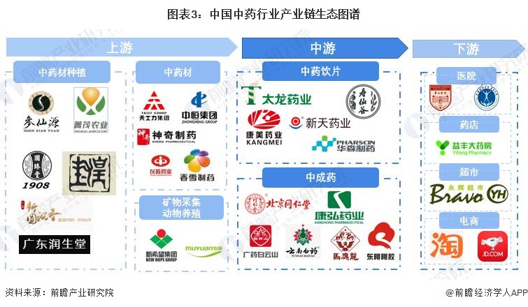 中藥產業鏈構成較為清晰。上游包括主要為中藥材的提供(包括前期的礦物採集、動物養殖和中藥材種植);中游包括中藥飲片加工和中成藥的加工;下游廣泛應用於醫院、藥店、超市、電商等。