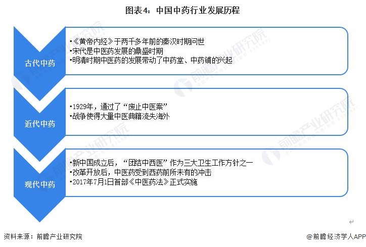 我國中藥的發展史,可分為古代中藥、近代中藥和現代中藥三個歷程。近年來,國家高度重視中醫藥行業的發展,《中醫藥發展戰略規劃綱要(2016-2030年)》《健康中國規劃綱要(2016-2030年)》和《中華人民共和國中醫藥法》等一系列戰略政策的頒佈為醫藥產業持續發展奠定良好的基礎。此外,《關於促進中醫藥傳承創新發展的意見》為中醫藥發展指明瞭方向。