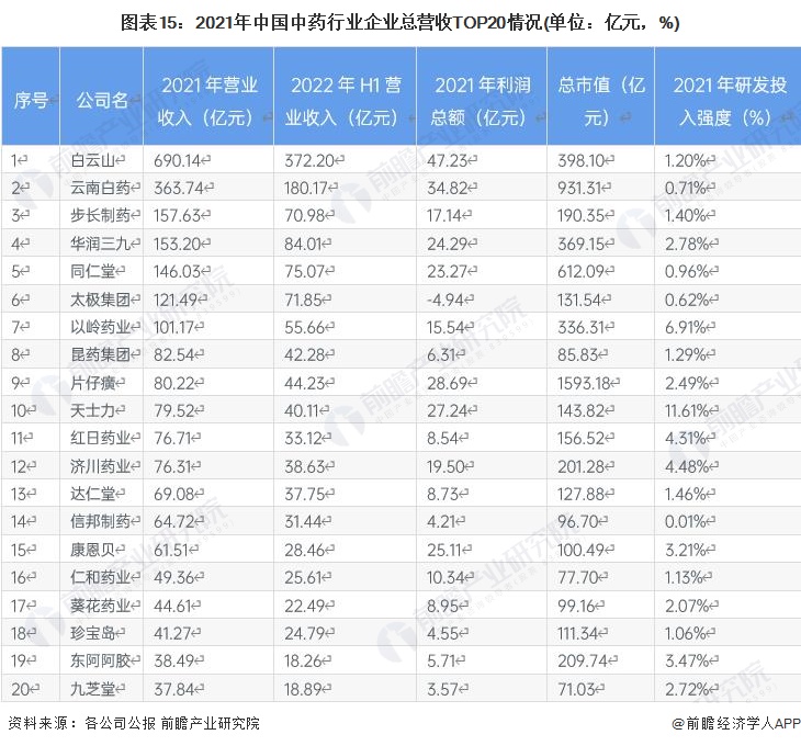 依據2021年中藥行業企業總營收情況,白雲山(600332.SH)以年收690.14億元位居我國重要行業的首位,其2022年上半年營收亦遙遙領先。其次為雲南白藥(000538.SZ),2021年營收363.74億元,2022年上半年營收亦與第三位差距較大,且前兩家企業的盈利能力亦較強。但總市值以片仔癀(600436.SH)最高。