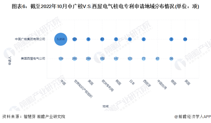 目前,中廣核核電專利申請區域主要集中在中國,而美國西屋電氣核電專利在全球分佈較為分散,兩者在美國申請的核電專利數量分別為123項和260項,兩者在中國的核電專利申請數量分別為5858項和109項。