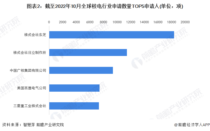 根據智慧芽數據,全球核電行業專利申請數量TOP5申請人分別是株式會社東芝、株式會社日立製作所、中國廣核集團有限公司、美國西屋電氣公司、三菱重工業株式會社。其中中國廣核集團有限公司與美國西屋電氣公司分別為中美兩國上榜的龍頭企業。