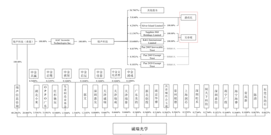 根據誠瑞光學招股書披露,瑞聲信息諮詢、瑞聲科技(香港)、湖北小米分別持股60.29%、20.81%、3.56%,前十大股東合計持股93.85%。