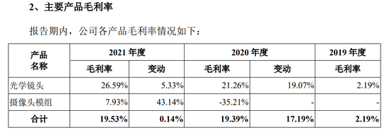毛利率方面,2019年至2021年,公司主營業務毛利率分別為2.19%、19.39%和19.53%,其中,作為公司主要收入來源的光學鏡頭產品毛利率由2019年的2.19%提升至2021年的26.59%。