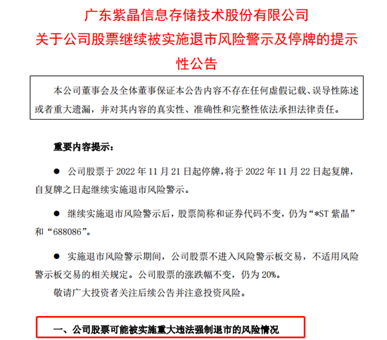今年11月19日,*ST 紫晶公告稱,公司股票可能被實施重大違法強制退市。