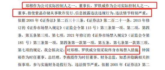 監管部門作出的懲罰是:對實控人之一、董事長鄭穆,對實控人之一、董事羅鐵威的欺詐發行行為,採取了罰款+終身市場禁入措施;對上市公司紫晶存儲採取了罰款措施。