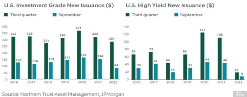 據標普統計,今年上半年全球債券發行量為4.2萬億美元,較2021年上半年下降約11%,其中跌幅最大的是非金融公司,同比下降33%。三季度美國投資級公司債發行規模為2870 億美元,低於過去五年的平均水平(3230億美元)。