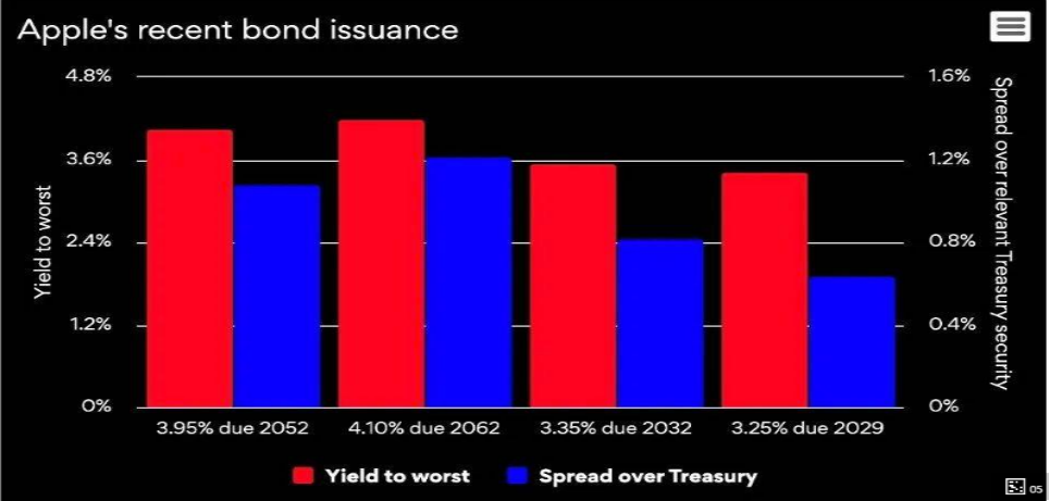 Meta發行的10年期票面利率為3.85%,蘋果發行的共計四批次55億美元的債券票面利率從3.25%到4.1%不等。