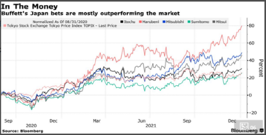 以2021年全年收益為基準,2021年巴菲特投資組合的收益約25%,同期標普500指數漲幅約27%,而日本五大商社股價的平均漲幅約39%,但2021年日元對美元貶值近10%,這麼一算,只能説是勉強持平於基準。