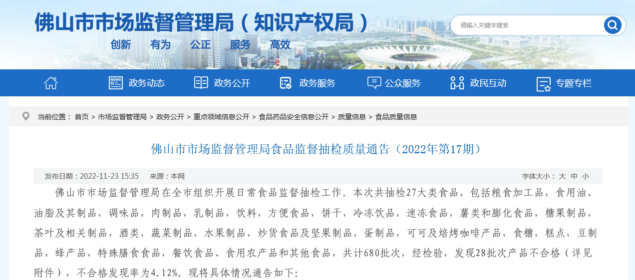 中國質量新聞網訊 2022年11月23日,廣東省佛山市市場監督管理局網站發佈食品監督抽檢質量通告(2022年第17期)。據通告,本次共抽檢27大類食品。其中,抽檢飲料樣品101批次,不合格3批次。