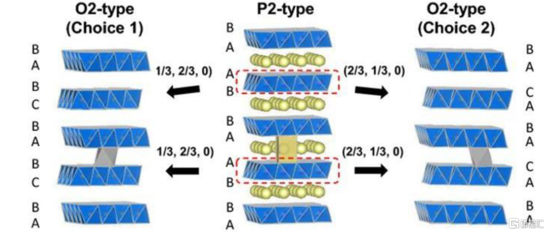 P2型(高穩定):P2結構中,NaO6三稜柱有兩種位置,一種是三稜柱上下兩側均與過渡金屬MO6八面體共稜連接,另一種是上下側均與過渡金屬MO6八面體共面連接。由於存在較強庫倫斥力,兩個相鄰位置不能同時佔據,通常缺鈉,鈉含量為0.5≤x≤0.8,因此P2型層狀氧化物只有在首周循環后獲得額外鈉補償才能實現高容量。電壓超過4.1V時,P2型NaxMO2會經歷P2⇔O2相變,由於體積變化可能導致顆粒破碎或極片脱離,也會導致電化學性能較差,因此為使其脱鈉過程穩定,需要限制電壓範圍在4.1V內,或通過元素摻雜抑制高壓下的結構相變。