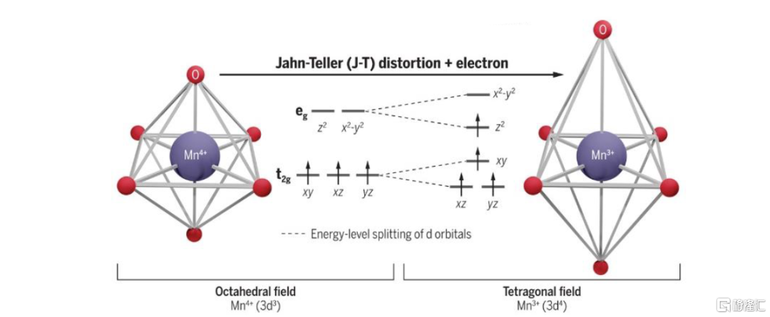 圖表:姜-泰勒畸變使得金屬-氧鍵軸向拉長,電荷轉移到軸向氧