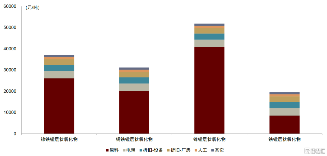 不同元素比例的層狀氧化物成本相差較大。鐵錳材料成本低,但是存在電壓滯后現象(有限電流通過電極時電極電勢偏離平衡電極電勢的現象,即爲了克服電流通過電極時的阻力需要一定的電極電勢作為推動力),鎳錳材料比容量高,但是循環性能不佳,通過部分過渡金屬取代可以實現更好的電化學性能。銅鐵錳、鎳鐵錳材料循環穩定性好,是常用的多元材料,結合振華新材回覆函中層狀氧化物的分子式、設備及廠房基建投資金額,我們分別測算了幾種二元、三元層狀材料的電池材料成本。