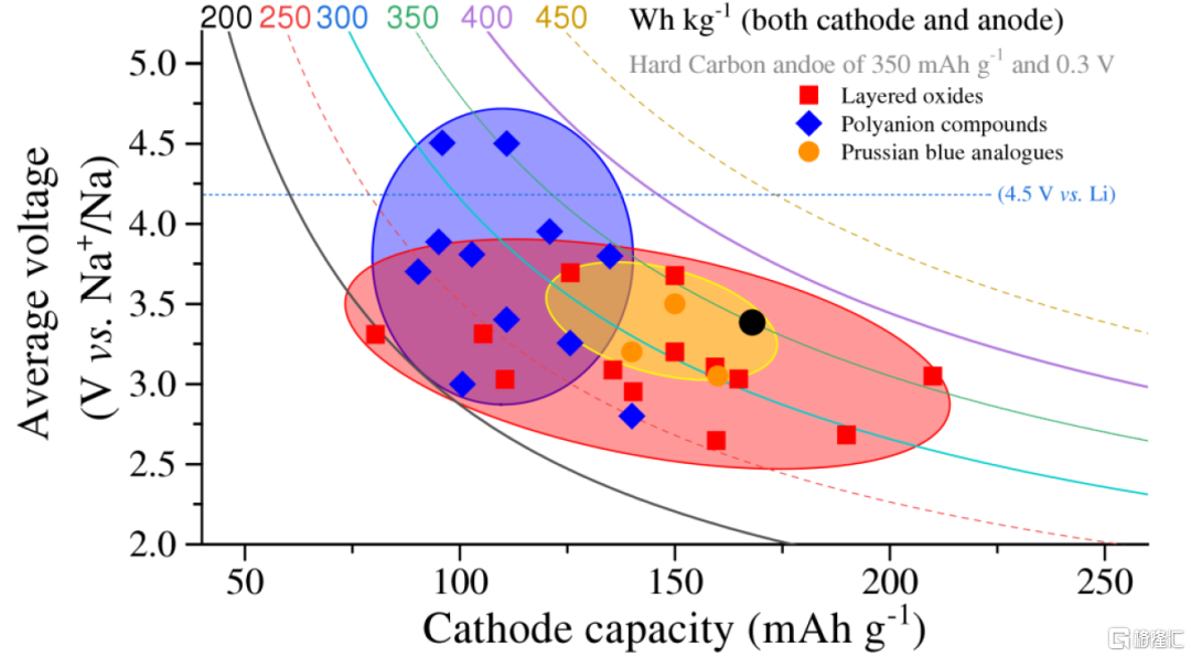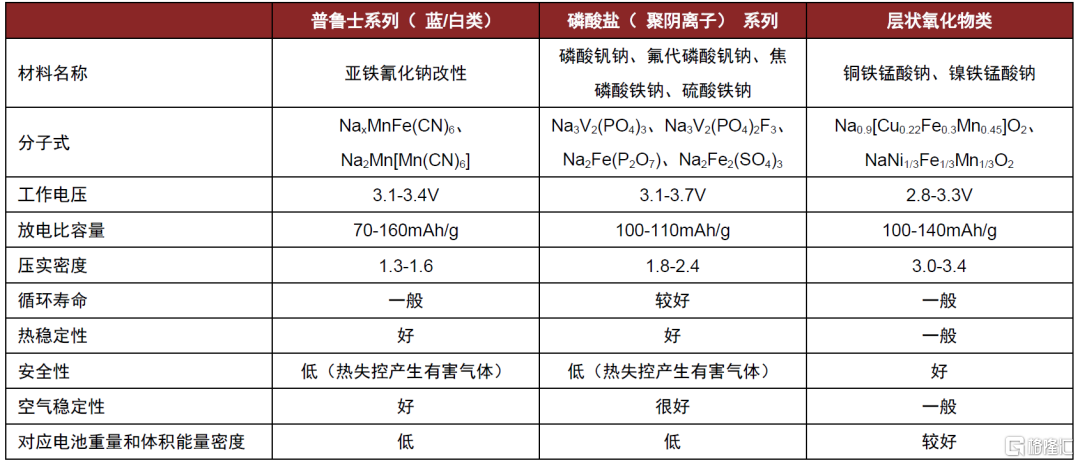 不同類型的正極材料結構和電化學特點差別比較明顯。層狀氧化物具有周期性層狀結構,能量密度較高,但大多容易吸水或與空氣反應;隧道型氧化物晶體結構中具有獨特的「S」形通道,具有較好的倍率性能,且對空氣和水穩定性高,但是其比容量較小;聚陰離子材料具有開放的三維骨架,倍率性能好,但是導電率較差,需要採取碳包覆和摻雜手段改善其電子和離子導電性,但又會導致其體積能量密度降低;普魯士藍類材料具有開放型三維通道,Na+可以在通道中快速遷移,其結構穩定性和倍率性能好,但存在結晶水難以除去及過渡金屬離子溶解的問題;有機類材料多電子反應,具有較高的比容量,但電子導電率較差,且易溶解於有機電解液中。