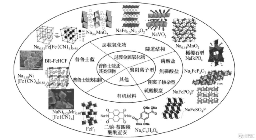 當前鈉離子電池正極材料主要有過渡金屬氧化物類、聚陰離子類化合物、普魯士藍類化合物、有機材料等。過渡金屬氧化物類、聚陰離子類化合物、普魯士藍類化合物的研究相對較多、產業化進程相對較快,過渡金屬氧化物類包括層狀結構氧化物和隧道結構氧化物,聚陰離子類包括磷酸鹽、焦磷酸鹽和硫酸鹽等。