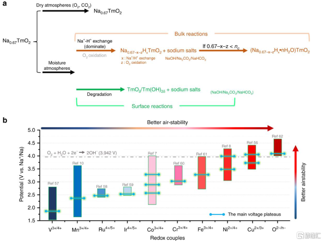 圖表:層狀氧化物空氣穩定性較差(b圖中靠近右上角表示空氣穩定性更好)