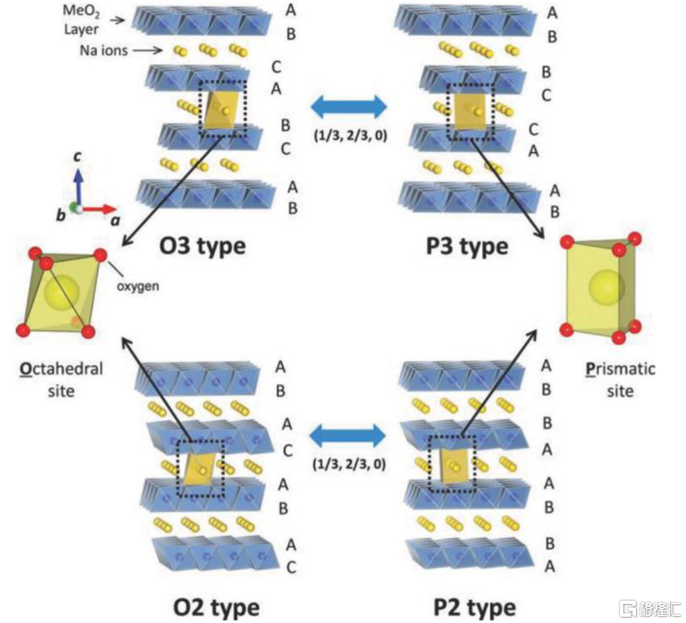 層狀氧化物晶體結構多變,鈉離子脱嵌路徑多。通常過渡金屬與周圍六個氧形成MO6八面體結構組成過渡金屬層,鈉離子位於過渡金屬層之間,形成MO6多面體層與NaO6鹼金屬層交替排布的層狀結構。根據x值及鈉離子存儲的位置的不同,可以劃分爲四種穩定的晶體學結構:O3、O’3、P3和P2,最常見的是O3型和P2型兩種結構。其中「O」或「P」表示Na+佔據八面體或三稜柱,數字2和3表示每個晶胞中由幾種堆疊形式的層狀結構組成。層狀氧化物中的一元結構存在結構不穩定、循環效率差等缺點,因此其研究多集中於多元結構。