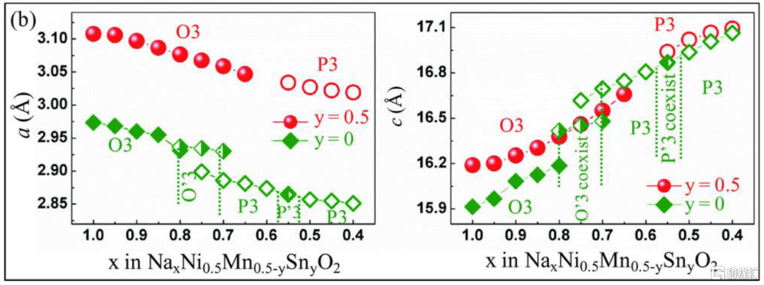 圖表:引入非過渡金屬離子Sn4+代替Mn4+抑制了Na+脱嵌過程中O3⇔P3的複雜相變