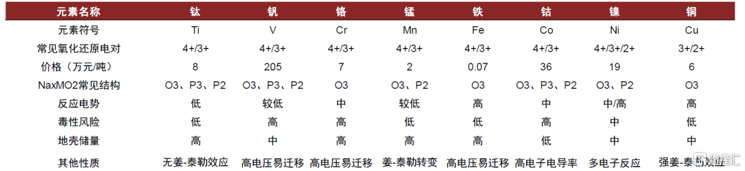 圖表:過渡金屬元素在層狀氧化物中的特點