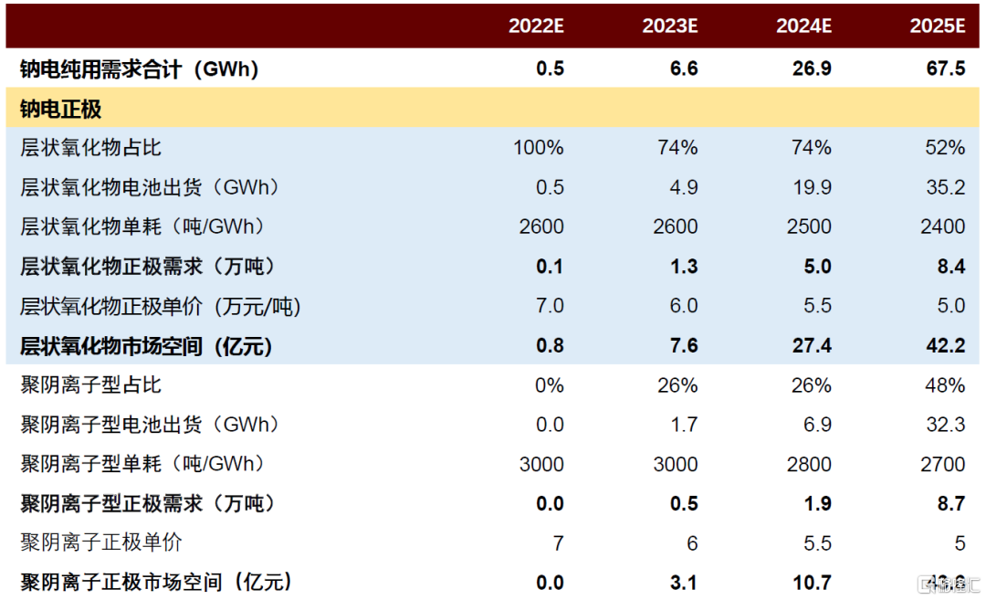 鈉電正極層狀氧化物和聚陰離子型有望齊頭並進,普魯士藍類材料在解決製備缺陷問題后會迎頭趕上。層狀氧化物和聚陰離子型分別適配動力、儲能場景,目前層狀氧化物產業化進程走在聚陰離子型前面,考慮兩大場景需求增速,我們預計2025年層狀正極需求量有望達到8.4萬噸,聚陰離子正極有望達到8.7萬噸。隨着正極材料出貨量增加,我們估計正極材料平均價格或將持續回落,我們估計2025年正極材料市場空間為85.8億元。普魯士藍類材料通過在非水溶劑中製備等方法解決製備過程的結晶水問題后,會由於其較好的理論性能進一步得到應用。