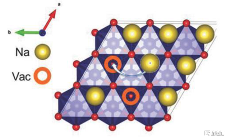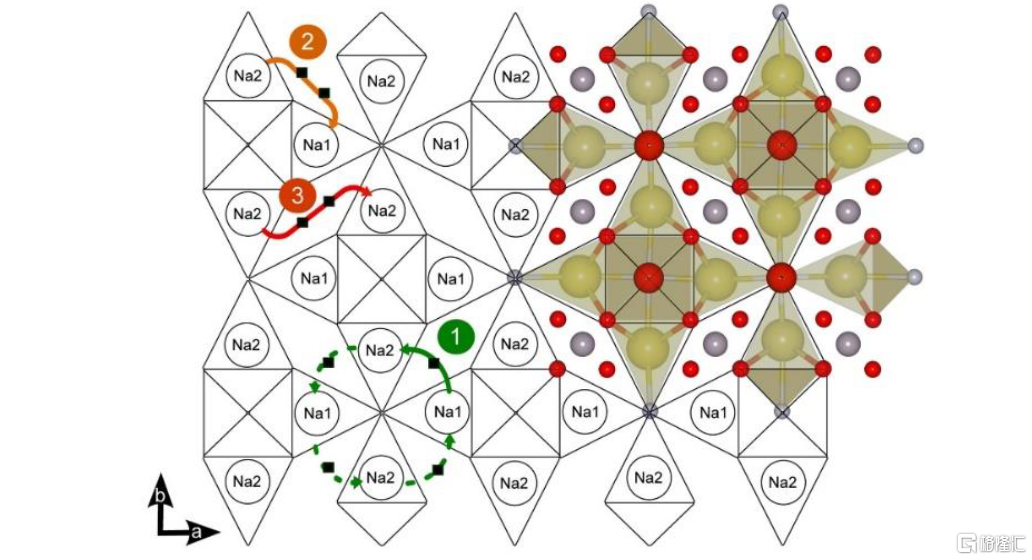 圖表:NaxV2(PO4)2F3晶格中的三種鈉位和對應的鈉離子遷移路徑