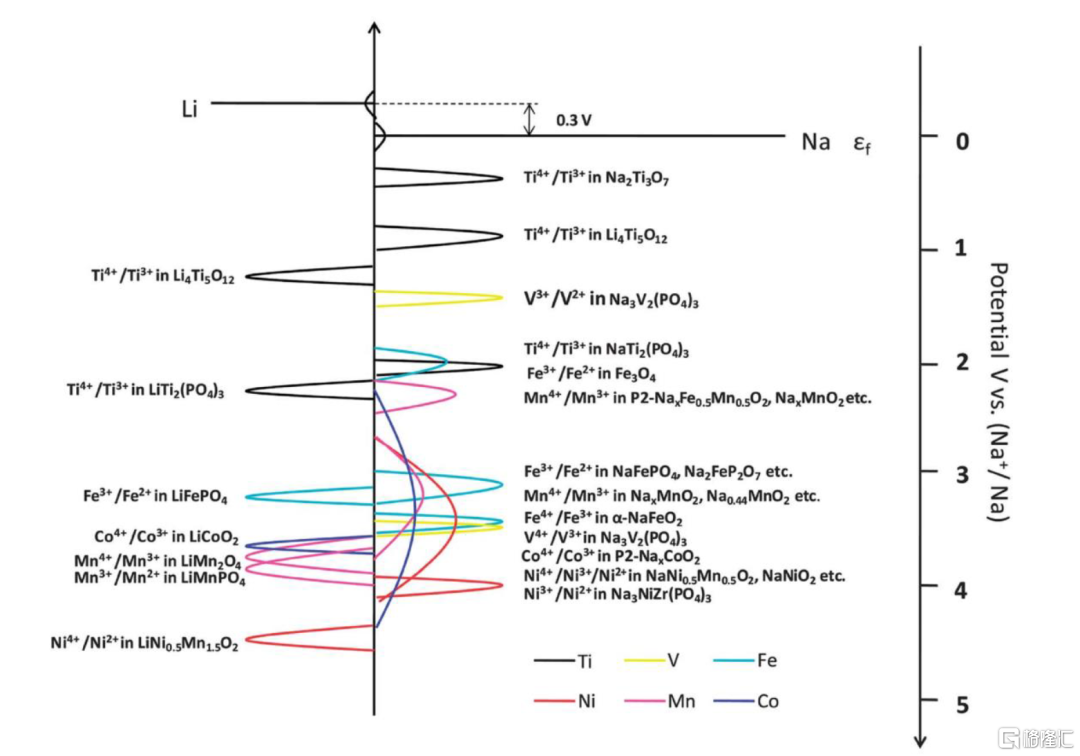 圖表:過渡金屬氧化還原電對在鈉電和鋰電中的電極電勢