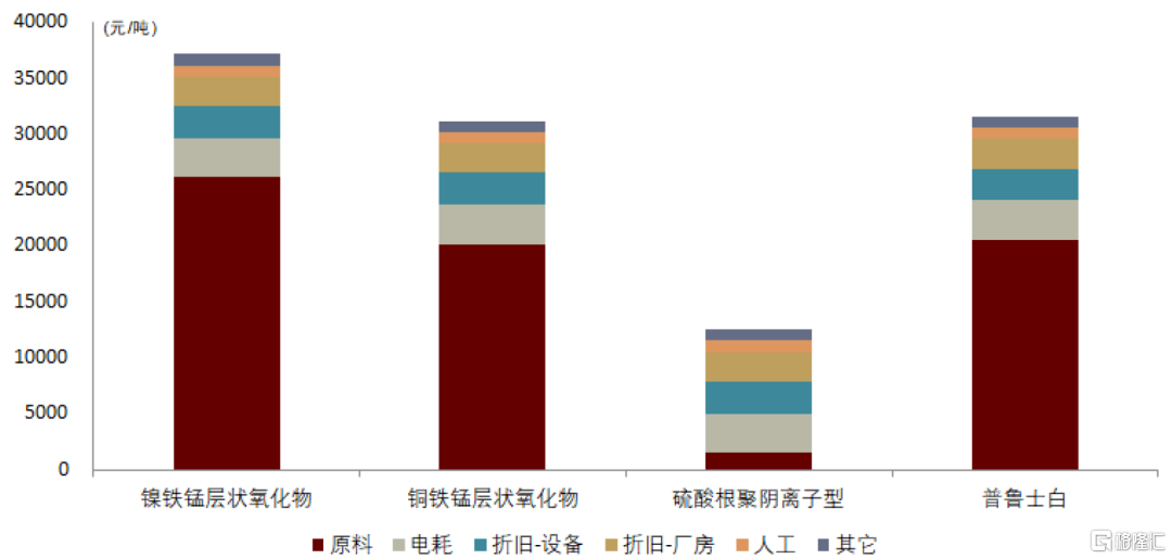 聚陰離子類材料大部分原料價格廉價易得,可以將成本降低到較低水平。聚陰離子型正極主要原料為硫酸鹽、磷酸鹽、鐵鹽、錳鹽,成本較低,部分路線含有釩元素,由於釩價格昂貴且有毒性,其產業化前景尚不明朗,無釩元素的聚陰離子類材料成本較低。