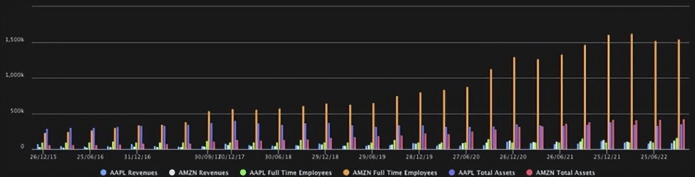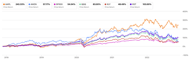 考慮到這兩隻股票在過去5年的表現,蘋果的表現超過了所有被分析參考的股票,其表現達到了249%,而亞馬遜的表現要差得多,在被分析期間的漲幅為57.17%,略好於標準普爾500指數。