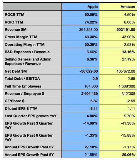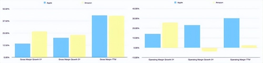 儘管兩家公司公佈的毛利率相似,但亞馬遜的毛利率增長率似乎從過去5年的26.81% CAGR下降到過去3年的23.42% CAGR,而蘋果的毛利率增長率在分析期間從14.13% CAGR加速到20.18%。