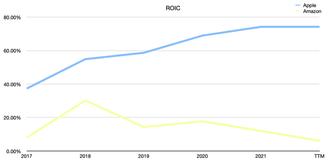 財務上的比較突出了這兩個巨人的主要相對優勢和劣勢。就投資資本回報率(ROIC)而言,這是我在考慮投資決策時考慮的一個非常重要的指標,因為一家公司必須能夠持續創造價值,才能成為一項可持續的投資。