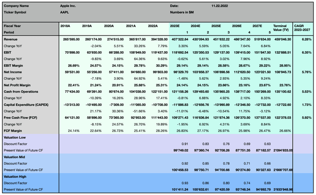 正如市場普遍預期的那樣,蘋果未來5年的自由現金流CAGR預計將達到5.92%,其營業和淨盈利能力的CAGR分別增長6.35%和5.76%,而其收入預計將穩步增長6.28%,高於全球消費電子行業的預期增速,但低於全球IT服務市場的預期增速。