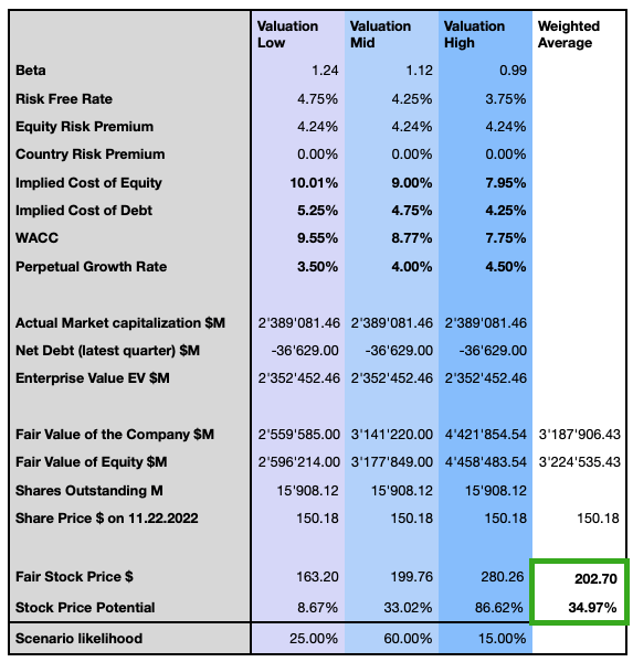 我根據三種不同情況的可能性來計算我的觀點,因此,我認為該股被嚴重低估,加權平均目標價為203美元,有35%的上漲潛力。