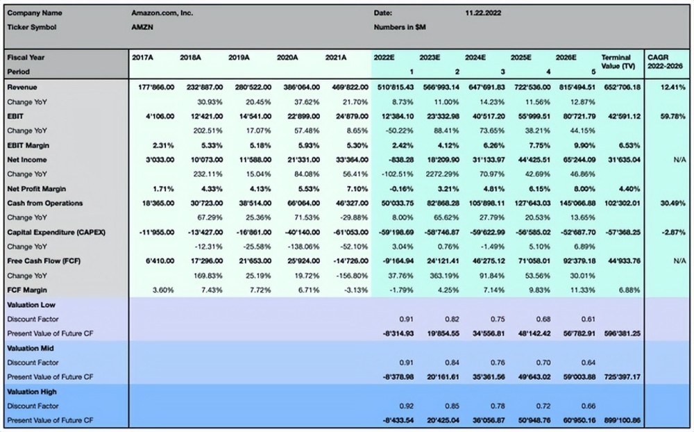 亞馬遜在2021年11月形成雙頂后遭受了重大損失,導致投資者的價值被大規模摧毀,自那以來股價下跌超過50%。在下一節中,我將展示對這兩家公司未來幾年的預測,以及實際股價是否可能提供一個有趣的機會,同時還將評估不同情況下可能存在的風險。